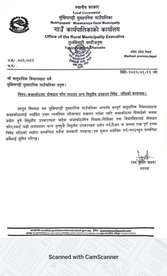 कक्षाकोठामा मोबाईल फोन लगायत अन्य विद्युतीय उपकरण निषेध गरिएको सम्बन्धमा ।
