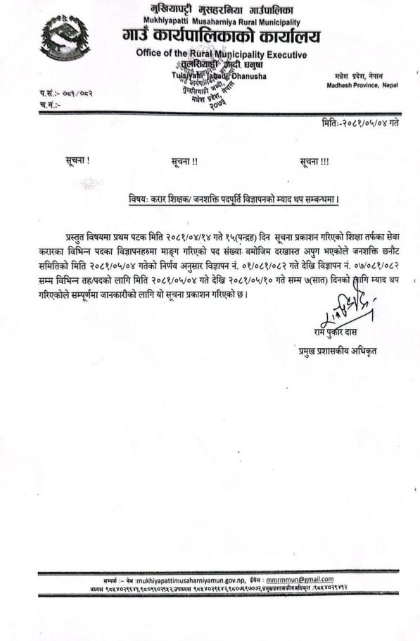 करार शिक्षक पदपूर्तिको विज्ञापनको म्याद थप सम्बन्धी सूचना