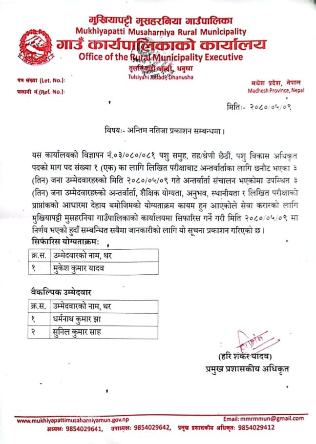 पशु विकास अधिकृतको अन्तिम नतिजा प्रकाशन सम्बन्धमा ।