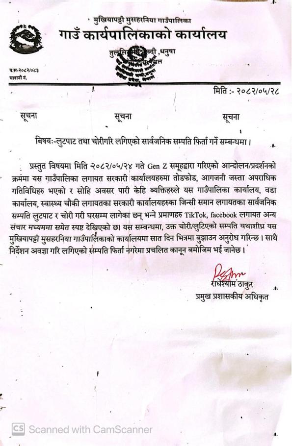 लुटपाट तथा चोरीगरि लगेको सार्वजनिक सम्पति फिर्ता सम्बन्धमा ।