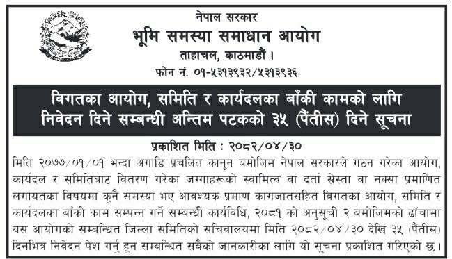 विगतका आयोग, समिति र कार्यदलका बाँकी कामको लागि निवेदन दिने सम्बन्धी अन्तिम पटकको ३५ (पैँंतिस) दिने सूचना ।