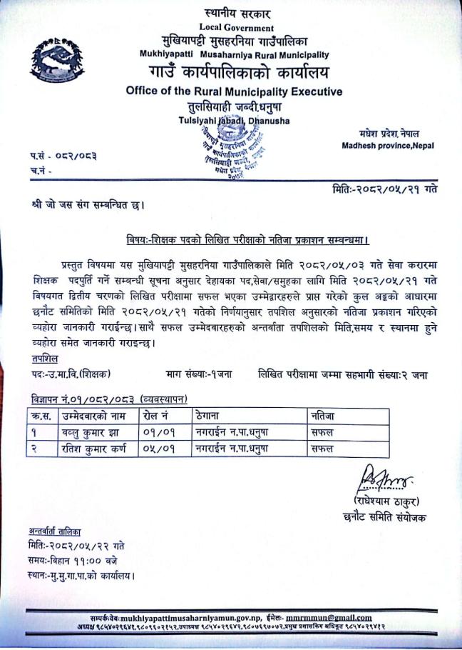शिक्षक पदको लिखित परिक्षाको नतिजा प्रकाशन सम्बन्धमा