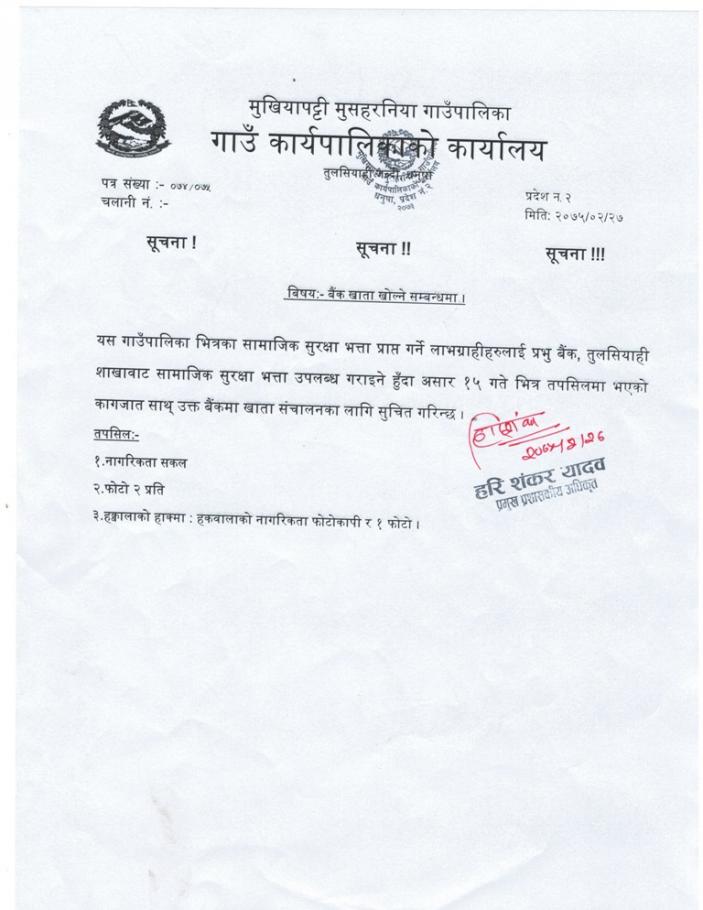 samajik suraksha bhatta baink marfat bitran garna Prabhu Baink ma Baink Khata kholne sambandhi suchana