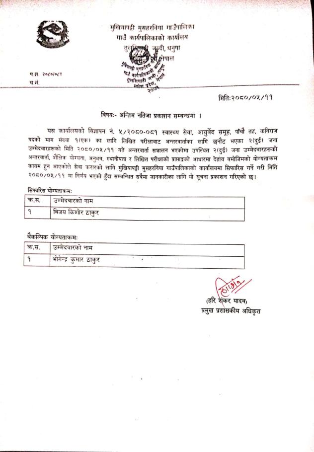 कविराज पदको अन्तिम नतिजा प्रकाशन सम्बन्धमा