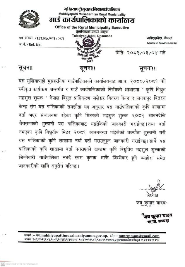 कृषि विद्युत महशुल शुल्क सम्बन्धमा ।