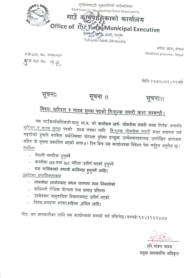 खरिदार र नायव सुब्बा पदको निःशुल्क तयारी कक्षा संचालन सम्बन्धमा