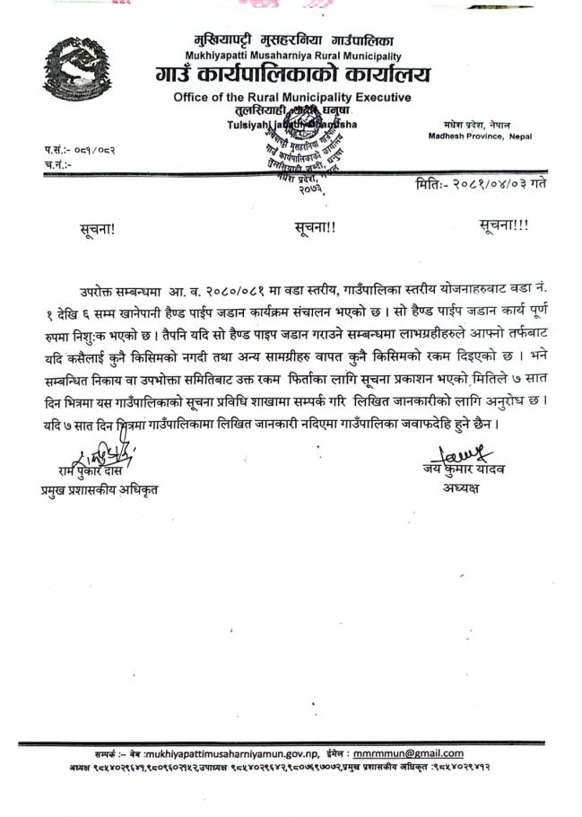 खानेपानी तथा हैण्ड पाइप जडान सम्बन्धि सूचना