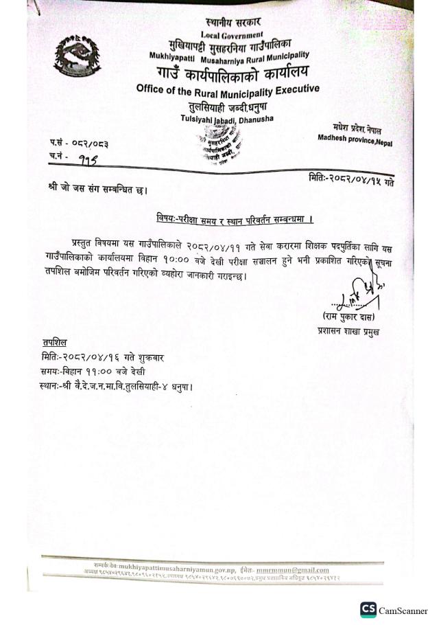 परिक्षा समय र स्थान परिवर्तन सम्बन्धमा ।