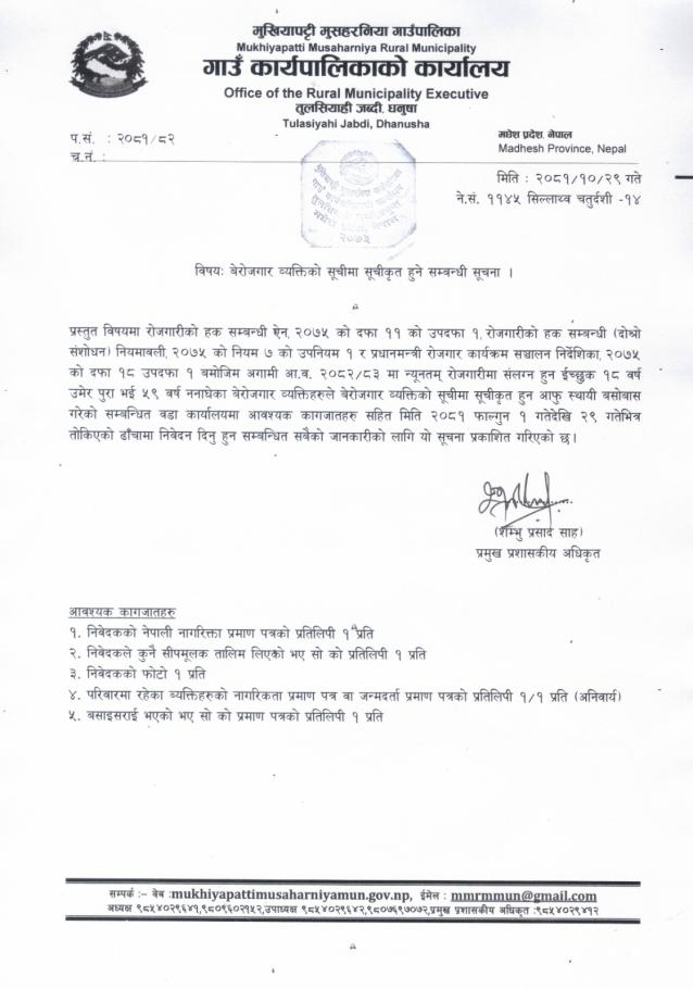 बेरोजगार व्यक्तिको सूचीमा सूचीकृत हुने सम्बन्धी सूचना