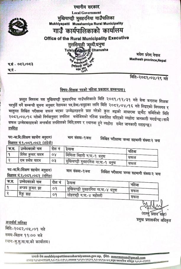 शिक्षक पदको नतिजा प्रकाशन सम्बन्धमा