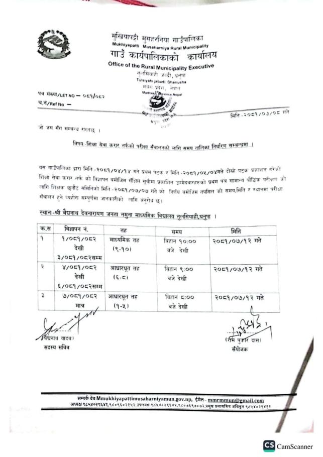 शिक्षक सेवा करार तर्फको परिक्षा संचालनको लागि समय तालिका सम्बन्धमा ।