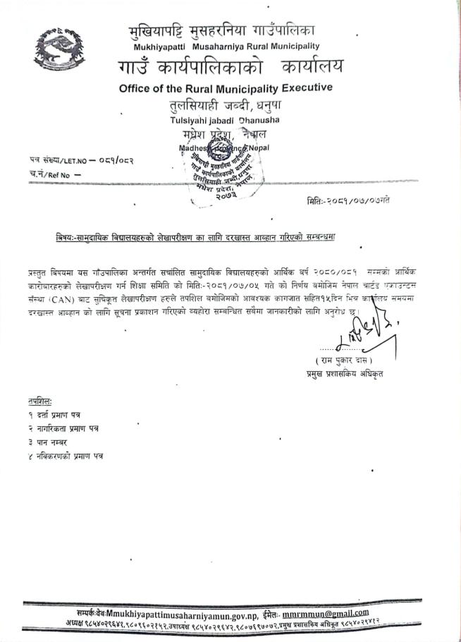 सामुदायीक विद्यालयहरुको लेखापरिक्षणका लागि दरखास्त आवहान सम्बन्धमा ।