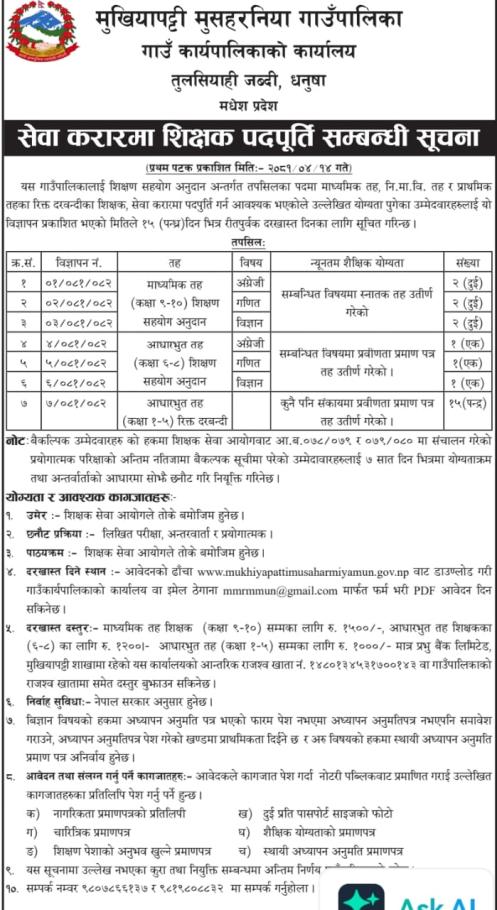 सेवा करारमा शिक्षक पदपूर्ति सम्बन्धी सूचना ।